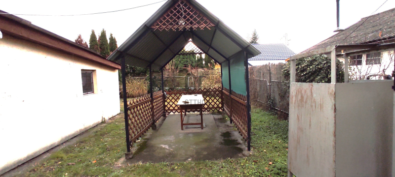 A családi összejöveteleknek, szabadtéri sütögetéseknek kényelmes fedett kerti kiülő ad helyet.