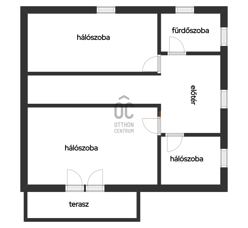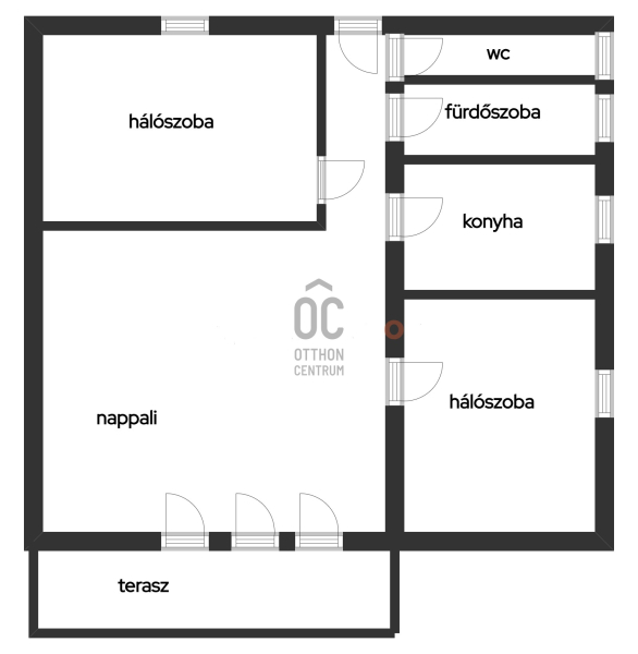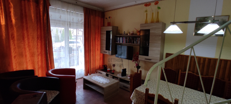 A bejáratnál nagyméretű teraszról lehet belépni az ingatlanba, ahol nappali, két hálószoba, konyha, fürdőszoba és külön wc található.