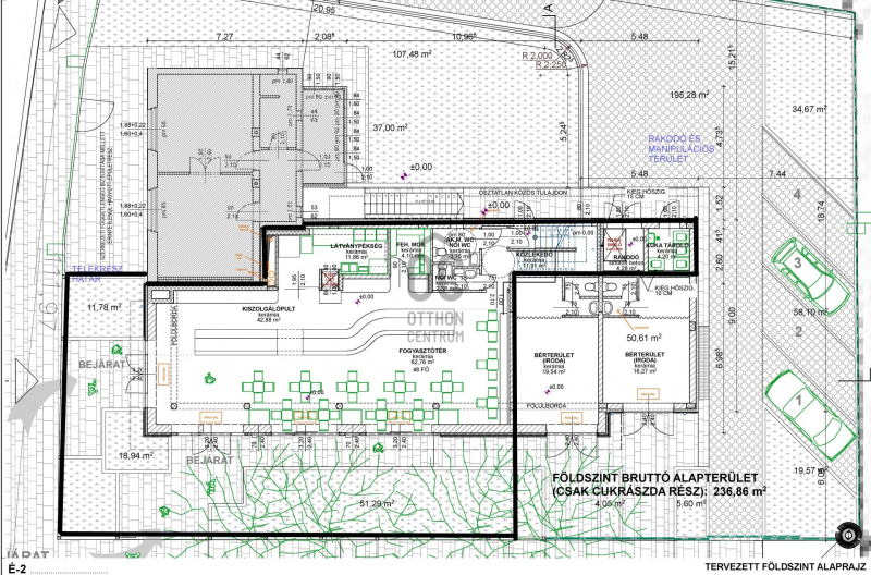 A földszinten lévő kb 133 nm eladótérhez külön női, férfi és mozgássérült wc, valamint egy külső szeméttároló helység is tartozik.