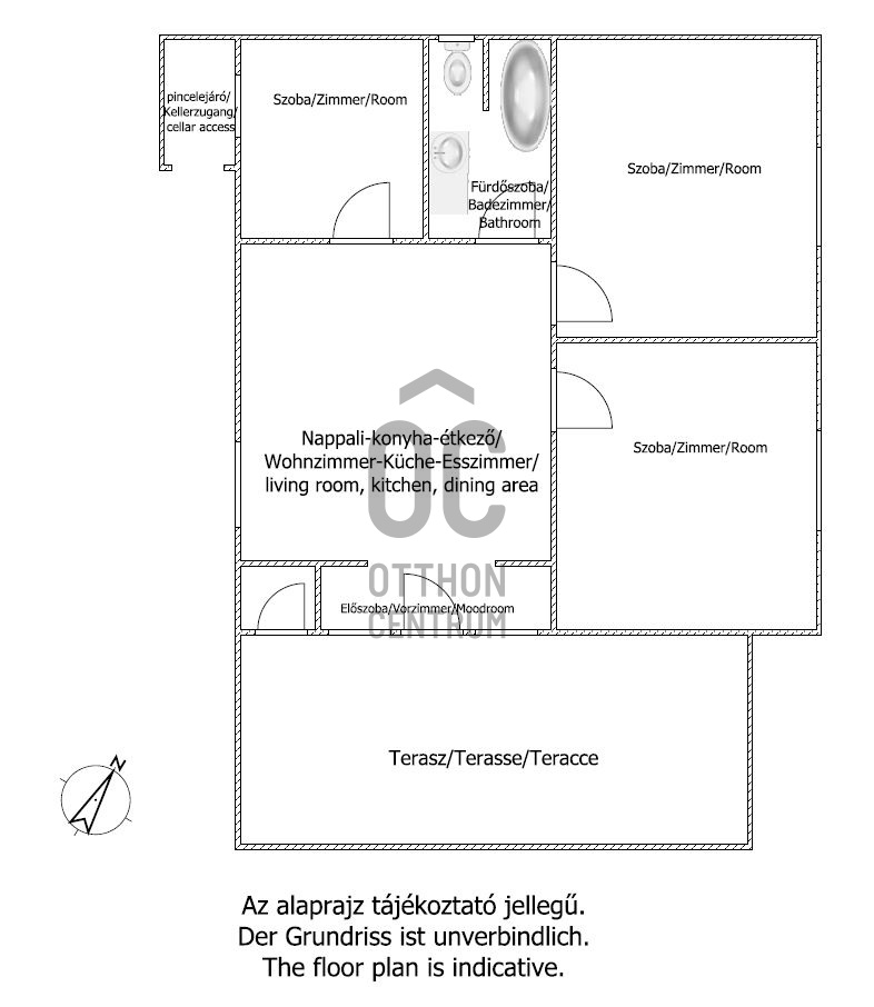 Az ingatlanba belépve az előtérbe jutunk, innen tárul elénk a nappali-konyha étkező hármasa. Ebből a térből nyilik a három hálószoba, valamint a fürdőszoba-wc.