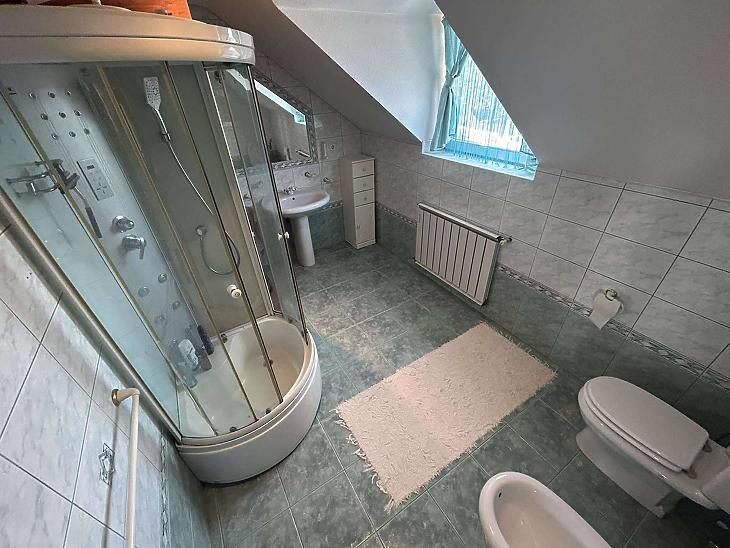 Emelet: 3 szoba, közösségi tér, zuhanyzós fürdőszoba + WC + infra szauna.