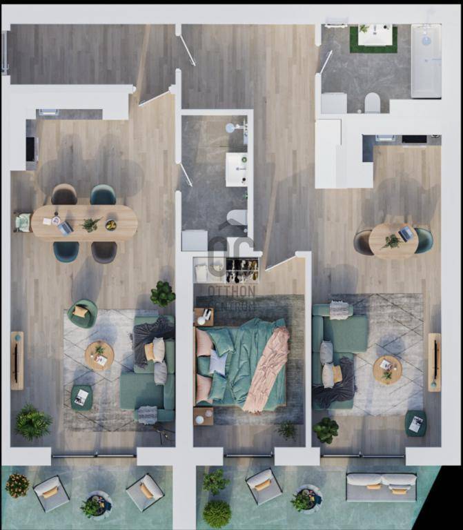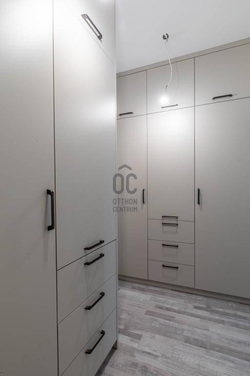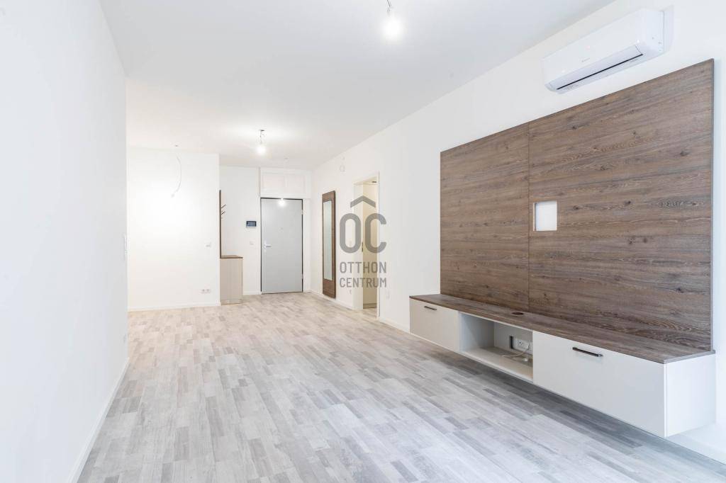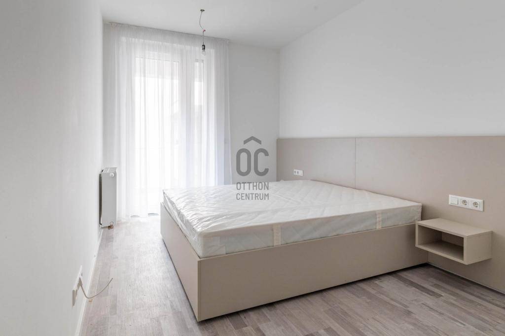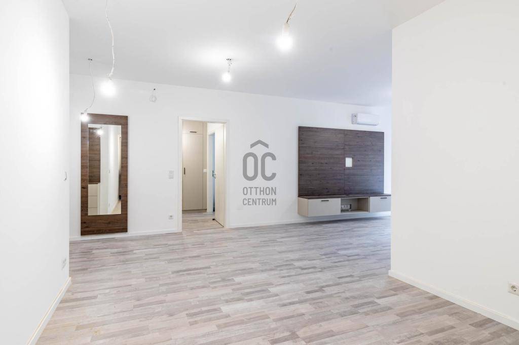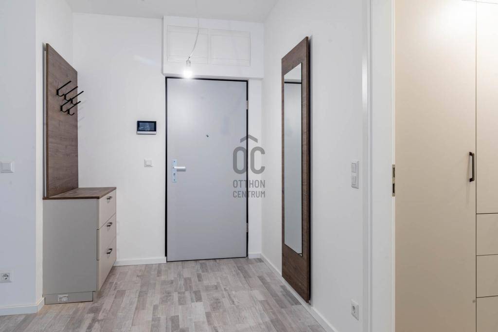 2 éve átadott épület 1. emeletén található, két önálló bejárattal rendelkező lakás teljesen különálló élettérként funkcionál – egy garzon és egy nappali + 1 hálószobás lakás alkotják, mindkettőhöz saját terasz és kertkapcsolat (30 m² és 12 m²) tartozik. (A lakás belső képei tájékoztató jellegűek: egy emelettel feljebb található, azonos bútorozottságú lakásban készültek.)