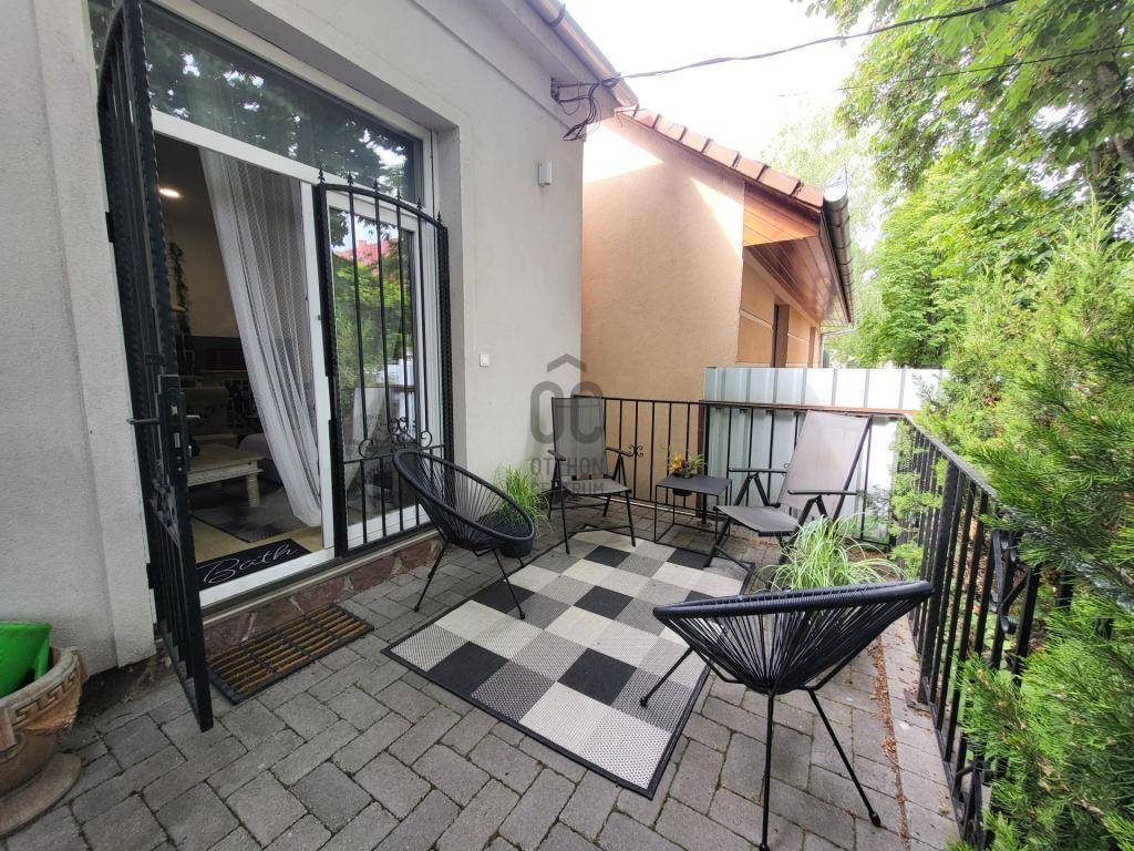A 25 négyzetméteres terasz ami a nappaliból nyilik és kertkapcsolatos is, az udvarban parkolási lehetőséggel.