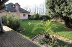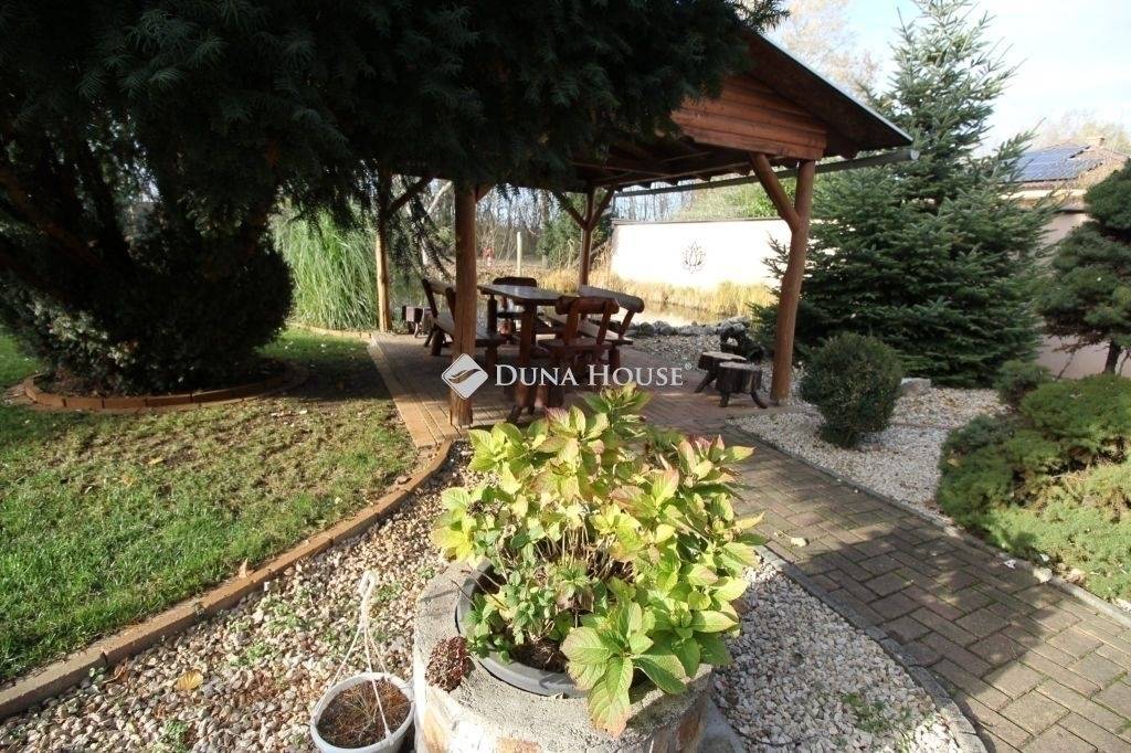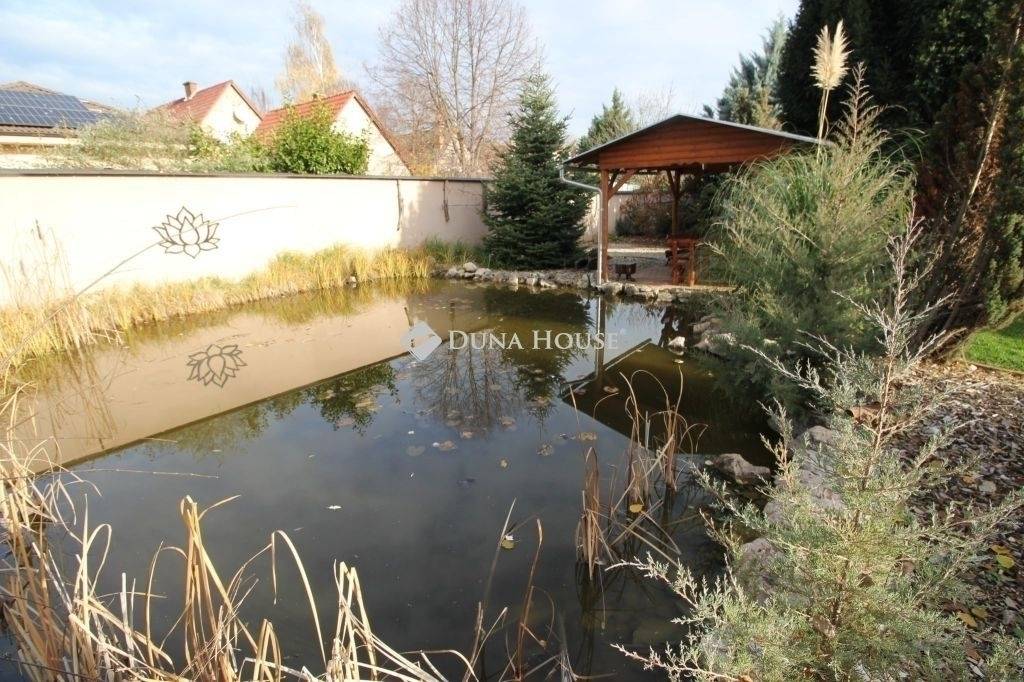Teljesen parkosított kert: automata öntözőrendszer, fedett kiülő, kis halas tó, több évtizedes növényzet