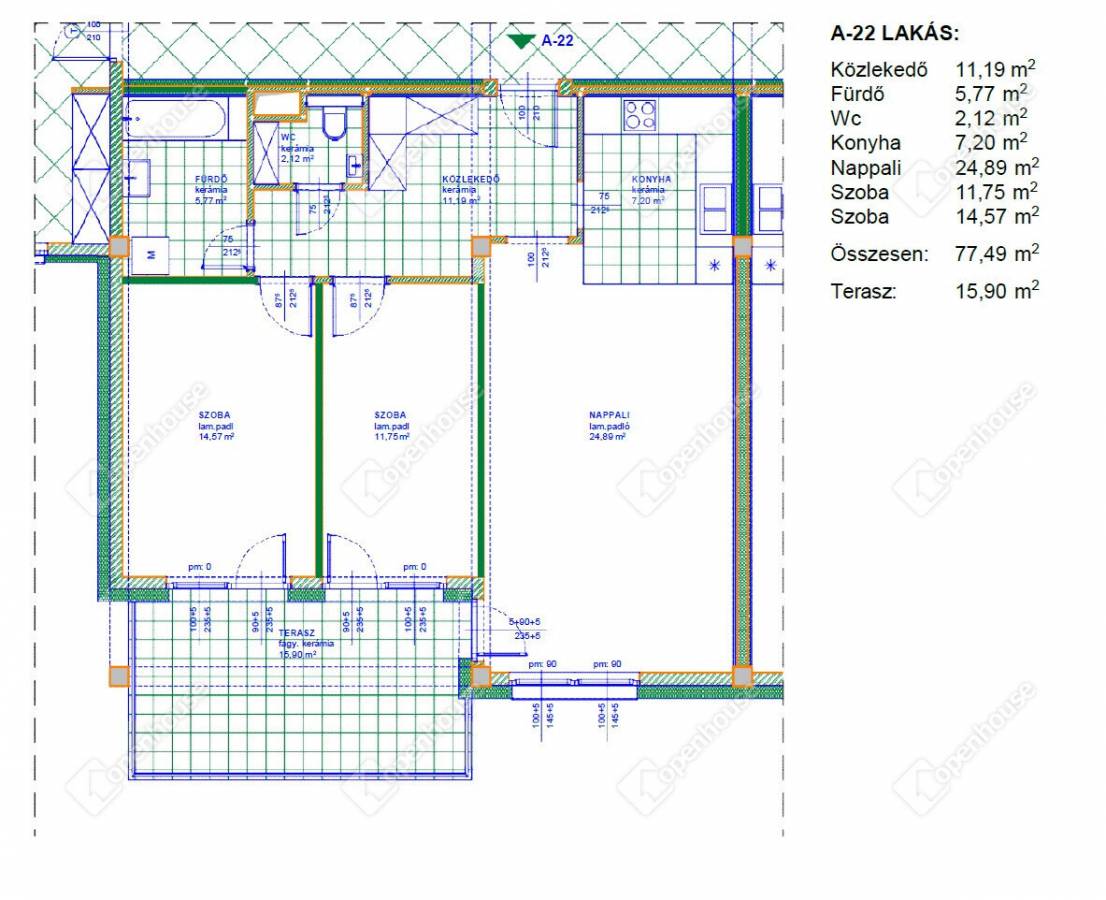 - Lakások Paraméterei: Nappali + 1 szoba 63m2-en, Nappali + 2 szoba 77 m2-en, Nappali + 2 szoba 100 m2-en 33 m2-es terasszal. Minden lakáshoz nagy alapterületű félig nyitott, félig zárt erkély tartozik, a földszinti lakások pedig kertkapcsolatosak.