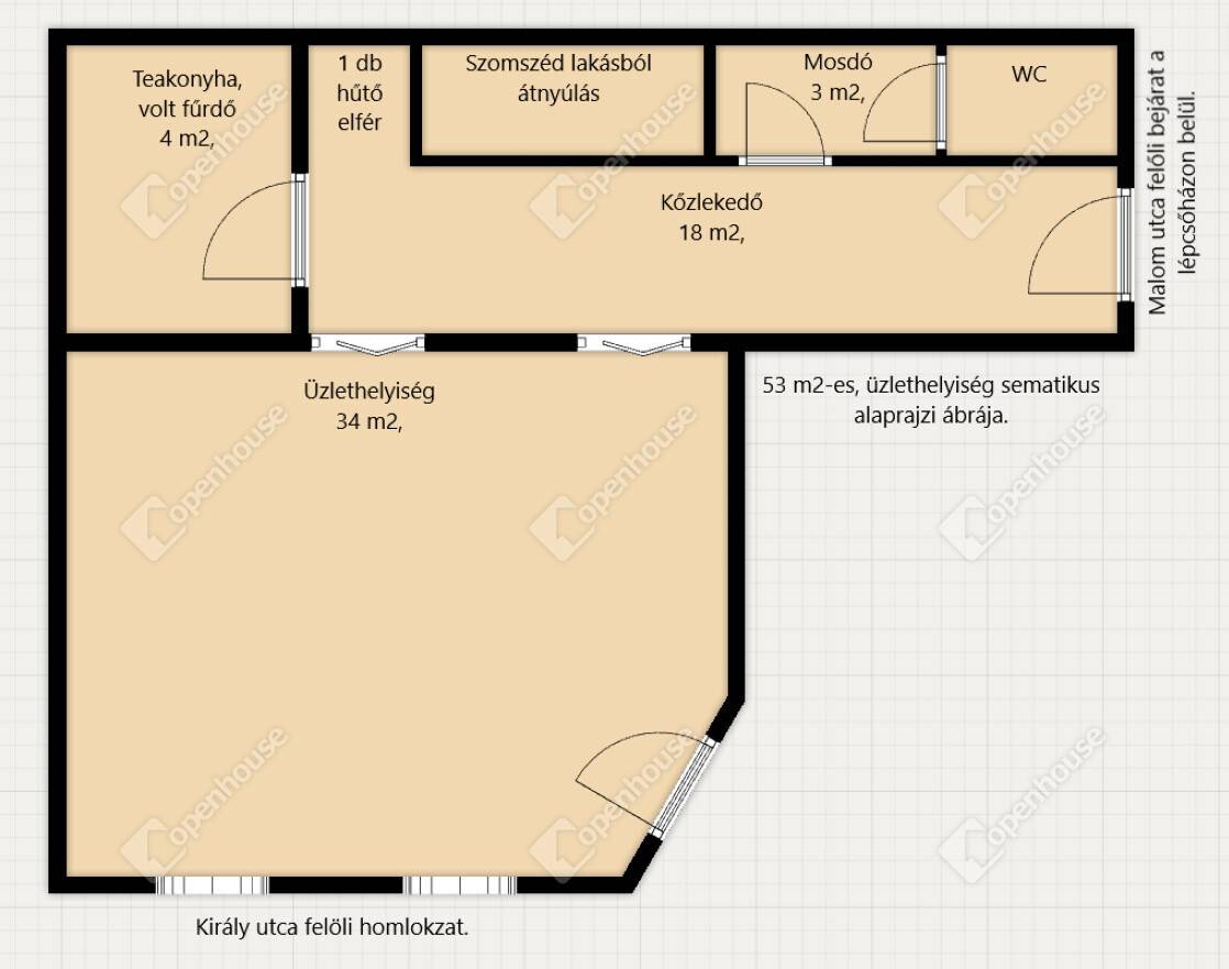 - az üzlet két külön bejárattal rendelkezik az ügyfelek a Király utca felől közelíthetik meg, míg a privát bejárat a Malom utca felől biztosított