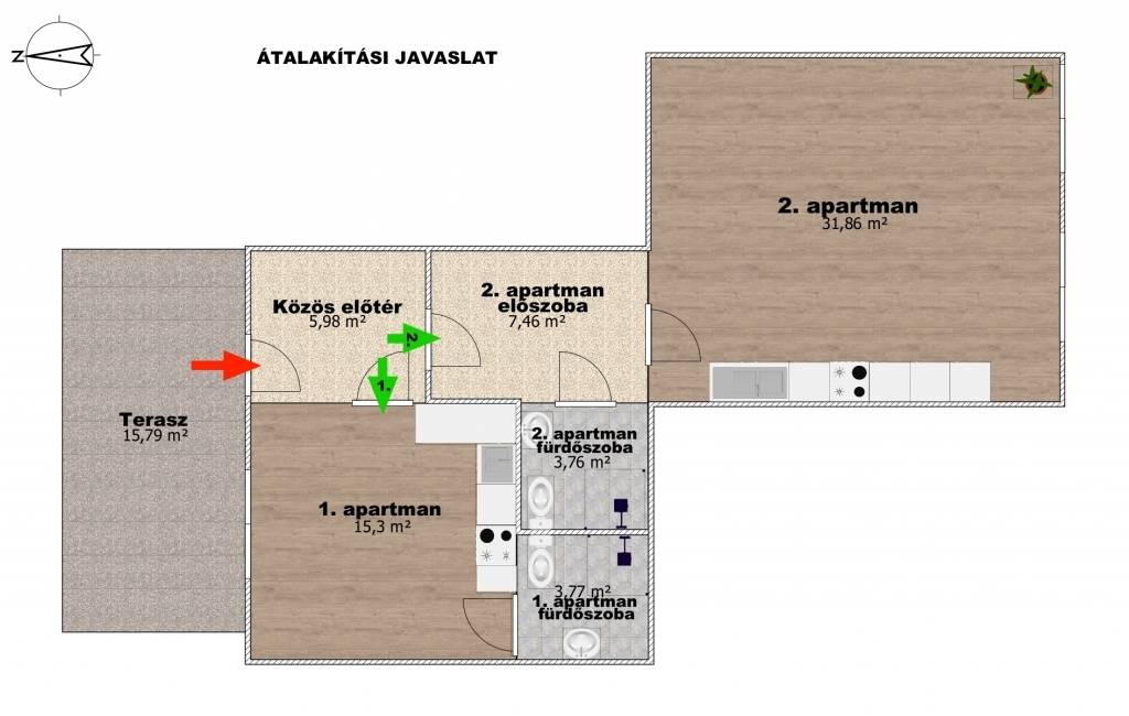 Az 67 négyzetméteres lakás 2 önálló részre választható szét, így 2 különbejáratú (konyhával, fürdőszobával ellátott) lakóingatlan alakítható ki, mint ahogyan az az átalakítási javaslaton is látható. Az így kialakított lakások kiválóan alkalmasak rövid- (Airbnb, Booking.com) és hosszútávú bérbeadásra is.