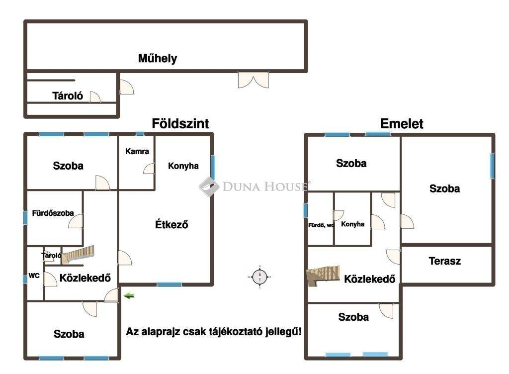 Földszint: 2 szoba, konyha+étkező, kamra, fürdő és külön WC, valamint tároló.