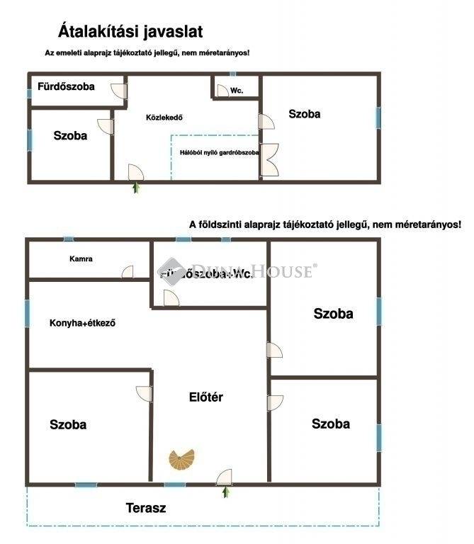 - Alsó szint: 3 külön nyíló szoba, nagy előtér, konyha–étkező, fürdő WC-vel, kamra