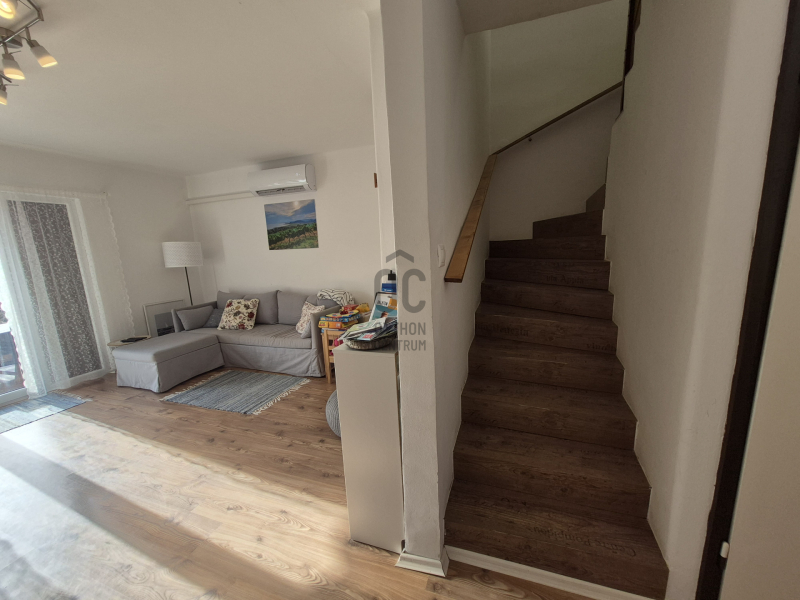 Elosztását tekintve az alsó szinten egy nappali-konyha-étkező található közvetlen terasz kapcsolattal, valamint egy vendég mosdó, míg az emeleten egy fürdőszoba és két, erkélyes hálószoba került kialakításra.