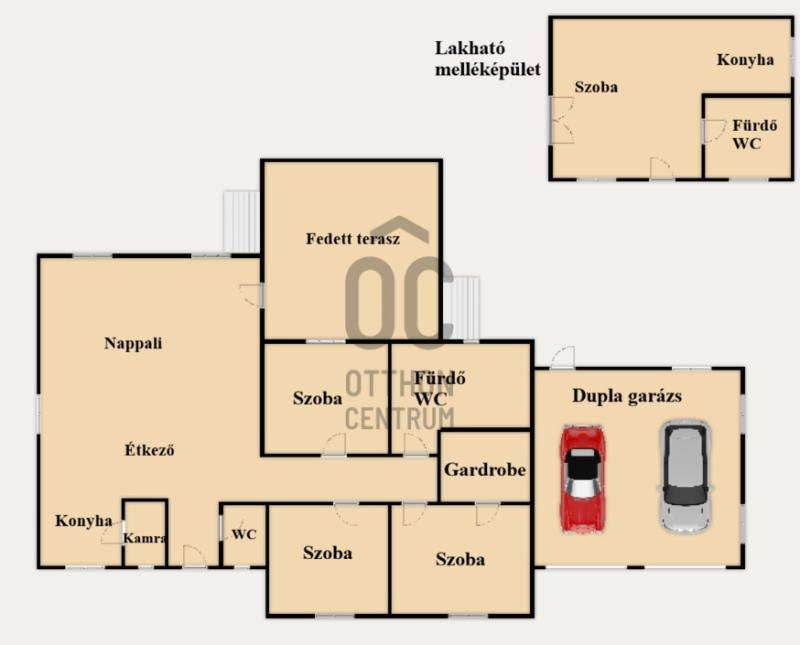 Az udvarban egy 38 nm-es, ÚJ építésű, ÖNÁLLÓ LAKÓÉPÜLET található saját autóbeállóval és utcára nyíló kapuval – igény esetén TELJESEN LEVÁLASZTHATÓ. Ez FIATALOKNAK praktikus megoldás a külön élettérre vagy rugalmas hasznosításra.