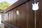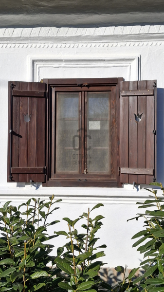 Minden nyílászáró szúnyoghálós, az ablakok tulipános faragású fa spalettásak.