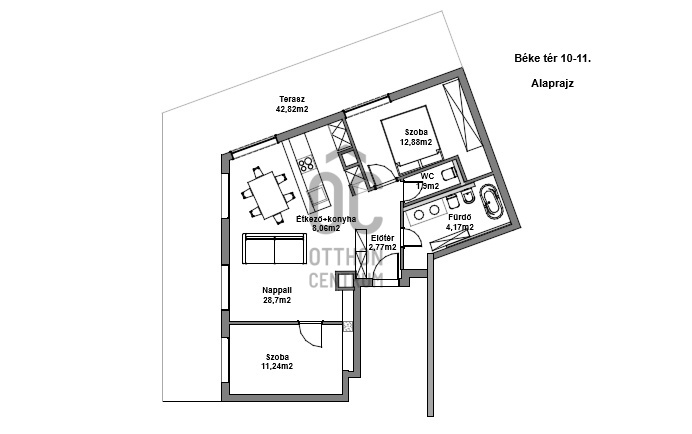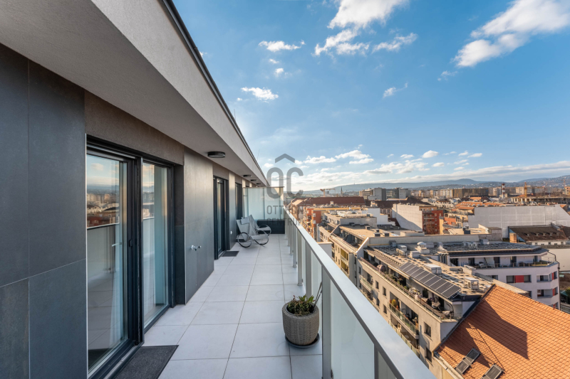 Ez a terasz nem csupán kiegészítője a lakásnak, hanem önálló lakóterület: egy olyan szelet, ahol a város ritmusa és az otthon csendje találkozik, és ahol könnyű elképzelni, hogyan néz ki itt egy átlagos este vagy egy hétvégi reggel: Van hely a nagy étkezőasztalnak, a függőszéknek, napozóágyaknak, növényeknek, egy kisebb jakuzzinak.