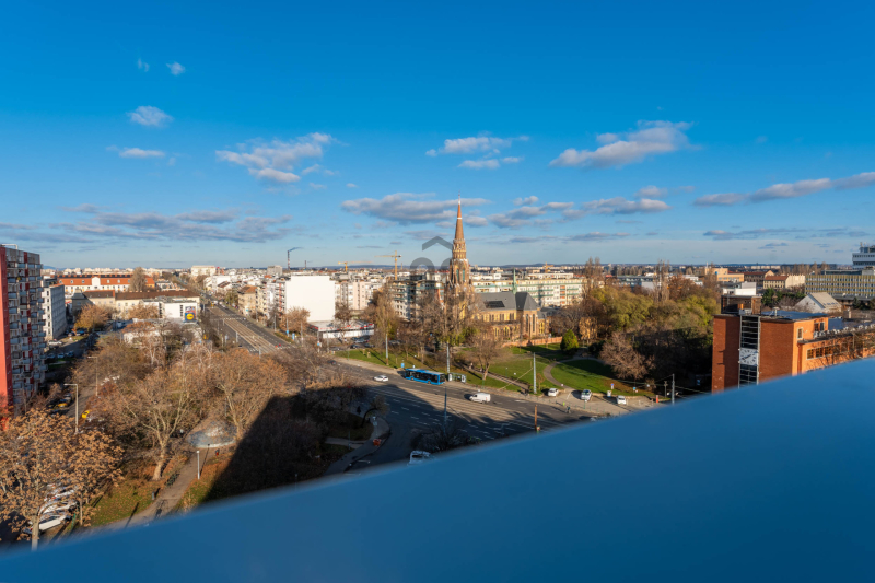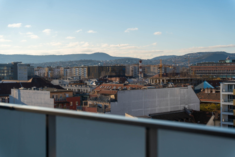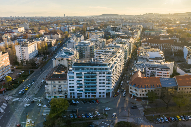 Budapest XIII. kerületében, Angyalföld egyik legújabb fejlesztésében, a 2023-ban átadott Béke Residence-ben található ez a 70 m²-es, nappali + két hálós penthouse lakás, 44 m²-es, teljes hosszban futó terasszal és elvehetetlen panorámával a Budai Várra, a Normafára és a Szent László templomra.