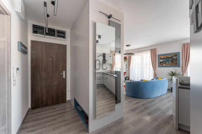A tárolókapacitás rendkívül erős: 30–40 pár cipő elhelyezésére alkalmas rendszer, ruhaliftes szekrények és több, padlótól plafonig futó beépített gardrób gondoskodik arról, hogy minden rendszerezve maradjon – ezek a megoldások a lakás praktikus oldalát hangsúlyozzák, és hosszú távon is hatalmas előnyt jelentenek.