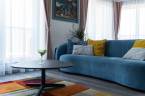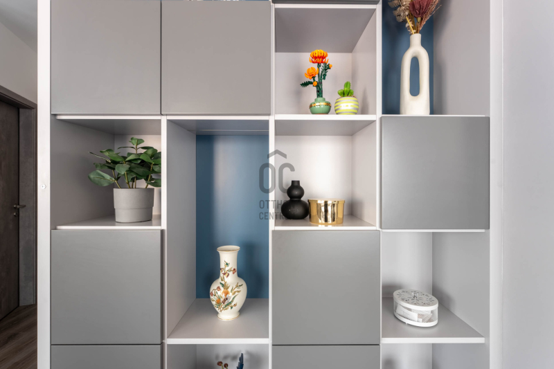 Már az előszoba is jelzi, hogy itt minden részlet összehangolt. A szürke és kék árnyalatok visszafogott eleganciája végigkíséri az egész lakást, a mozgásérzékelős LED fények pedig diszkrét ritmust adnak a tereknek.