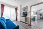 A nappali a lakás legnyitottabb pontja: nagy üvegfelületein át folyamatosan érkezik a természetes fény, amely könnyed, levegős hangulatot ad a térnek.