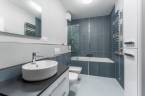 Letisztult, modern hangulat fogad a fürdőben: a nagyméretű szürke burkolatok nyugodt, rendezett hátteret adnak, a fehér szaniterek pedig tiszta kontrasztot teremtenek. A beépített kád kényelmes méretű, fölötte üvegfallal elválasztott zuhanykeret ad praktikus pluszt, így a helyiség két funkciót is gond nélkül kiszolgál.