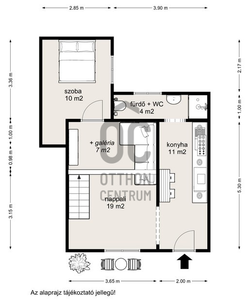 50 m2 lakótér: 33 m2 lakás + 10 m2 külön szoba + 7 m2 állógaléria