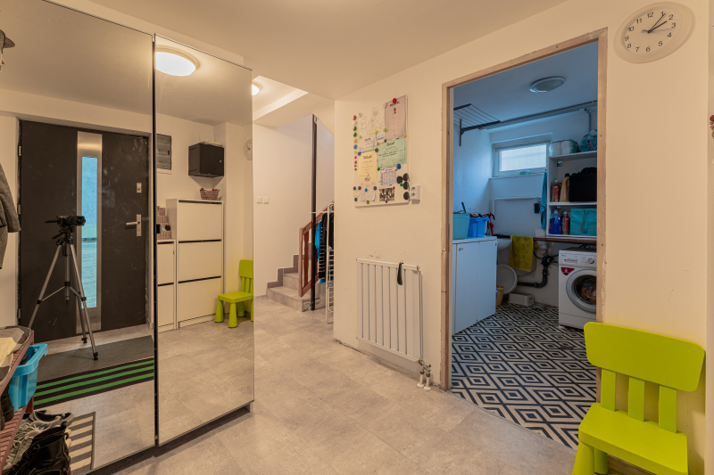 A ház három szinten helyezkedik el, a telek lejtésének köszönhetően az alsó és a középső szint is közvetlen kertkapcsolattal rendelkezik, ami ritka és rendkívül praktikus megoldás.