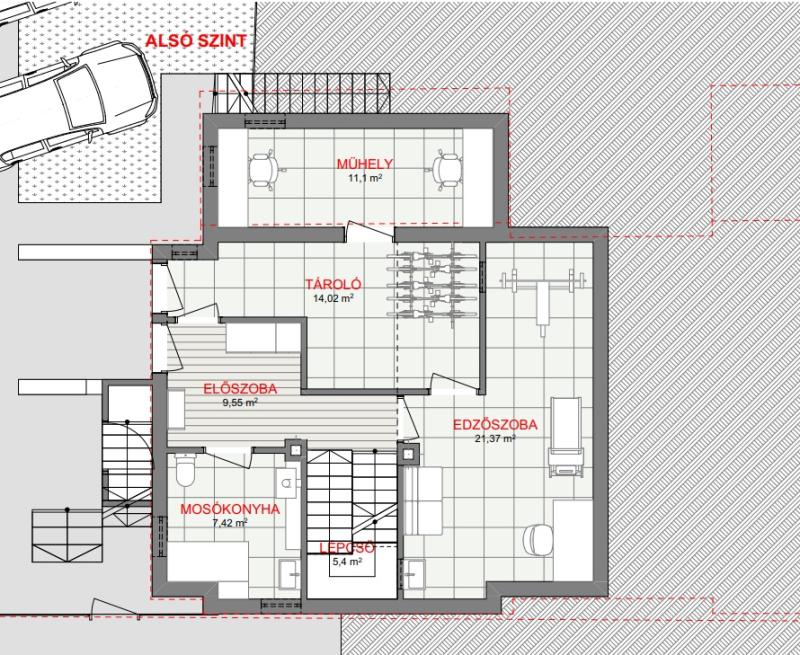 Az udvarban akár három autó kényelmes parkolására is van lehetőség úgy, hogy a felső kertrész és terasz teljes értékű zöld marad.