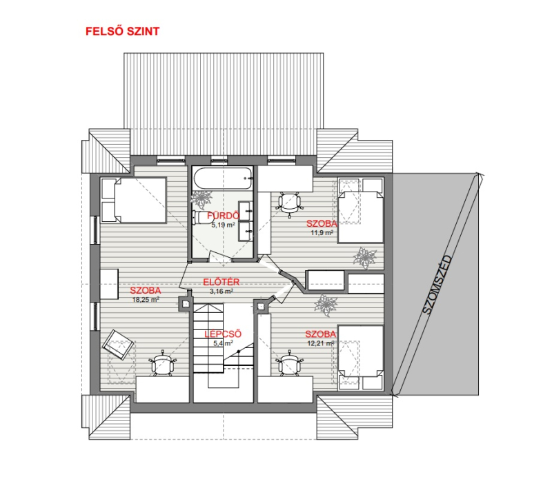 A legfelső, tetőtéri szinten három külön nyíló hálószoba került kialakításra, a szintet pedig egy tágas, dupla mosdós fürdőszoba egészíti ki, amely a mindennapi használat mellett a családi komfortot is maximálisan szolgálja.