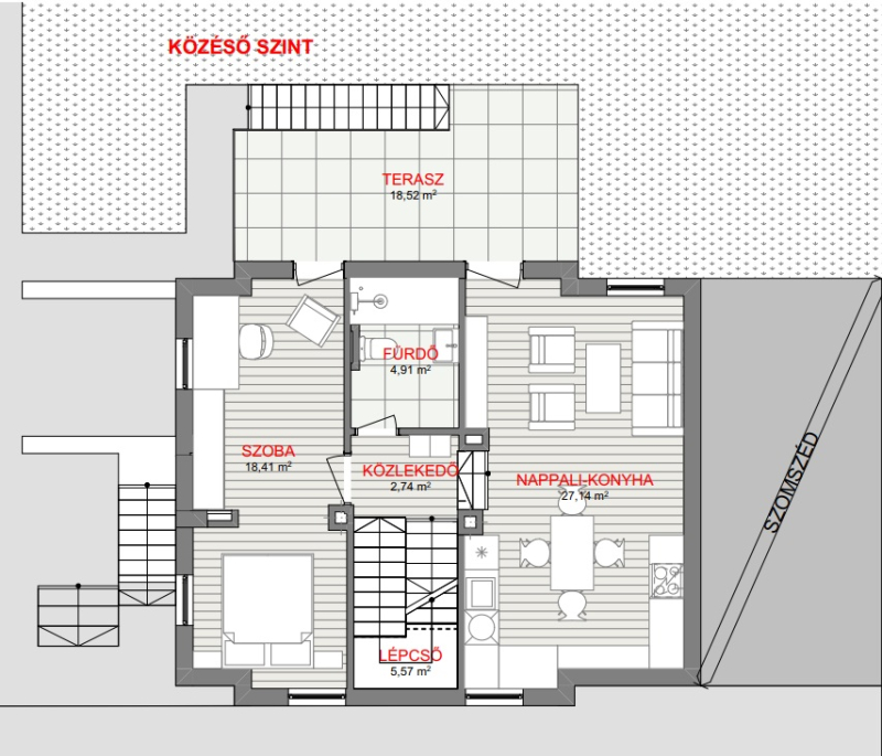 A középső szinten helyezkedik el a D-NY-i fekvésének köszönhetően a napfényes, amerikai konyhás nappali, ahonnan az igazán hangulatos terasz, gyönyörű kilátással, mely közvetlen kapcsolatot teremt a kerttel – tökéletes helyszín reggelikhez, baráti összejövetelekhez vagy esti pihenéshez. Emellett még ezen a szinten található egy nagy méretű hálószoba ami igény szerint kettéválasztható, szintén van egy kijárat a teraszra és egy fürdőszoba.