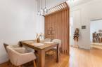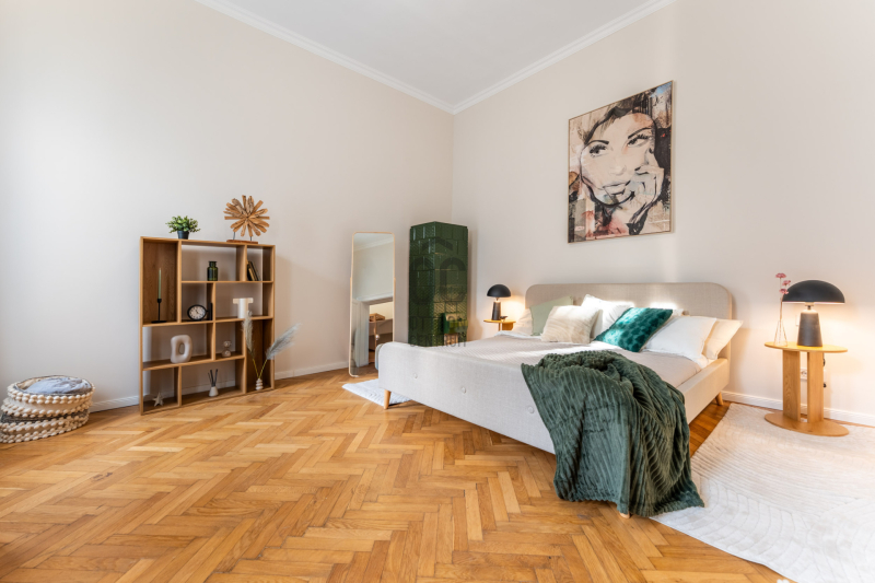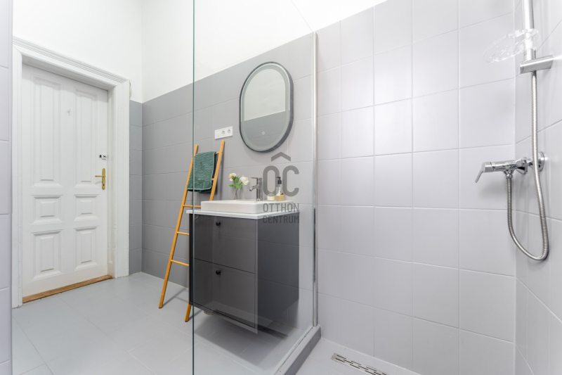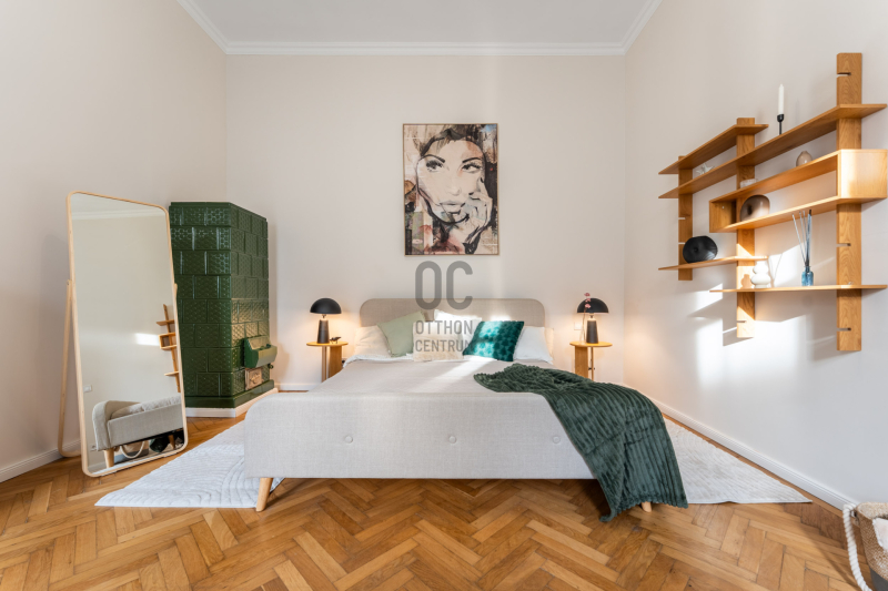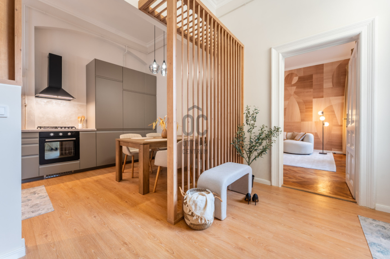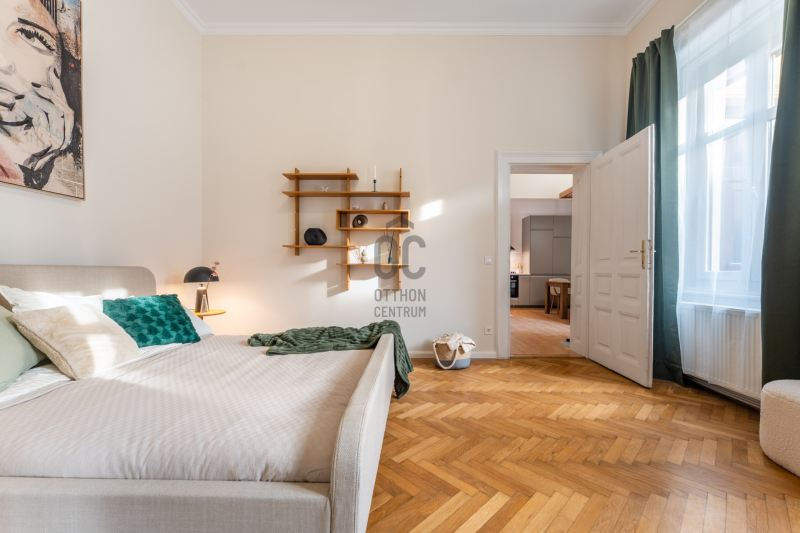 A lakás teljes körű felújításon esett át, minden eleme átgondolt tervezéssel és minőségi anyaghasználattal készült, miközben megőrizte a klasszikus polgári stílus jellegzetességeit: a 3,7 méteres belmagasságot, a halszálka parkettát és a régi típusú beltéri ajtók eleganciáját.