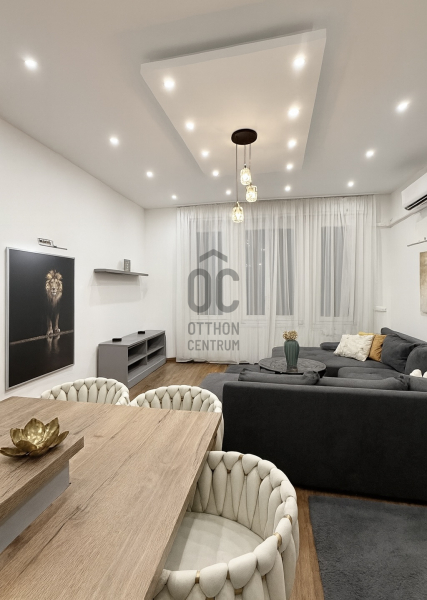A tágas, DK-i tájolású nappali gyönyörű LED-es álmennyezettel, modern konyhával és elegáns dekorral várja új tulajdonosát.
