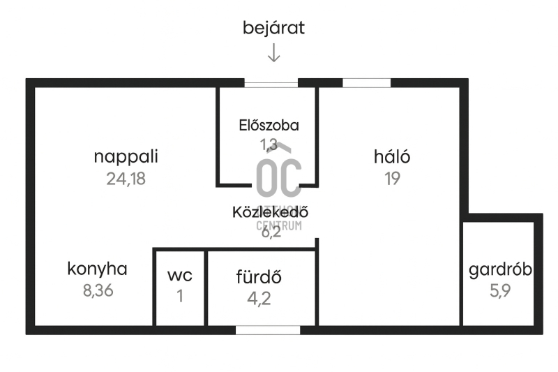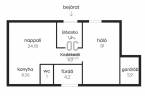 Helyiségek: nappali-konyha-étkező, hálószoba, fürdőszoba, külön WC -kézmosó, gardrób, előszoba