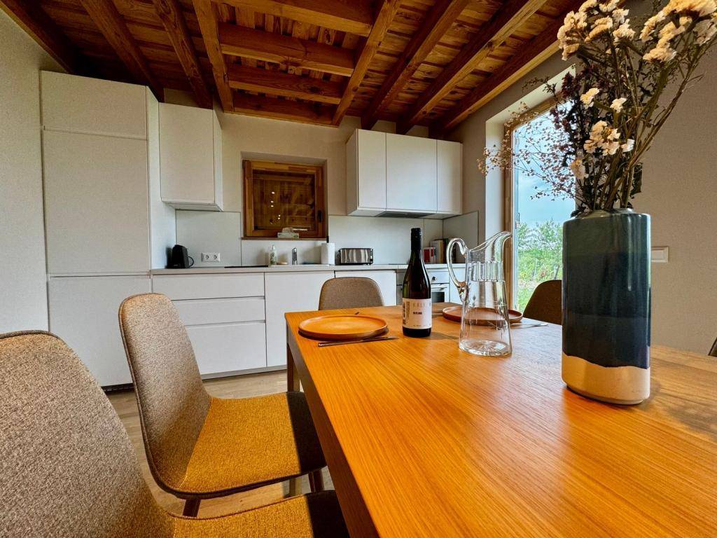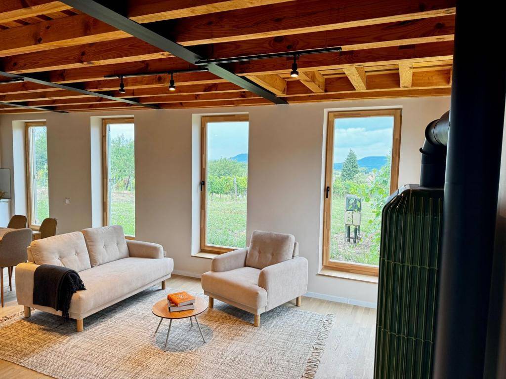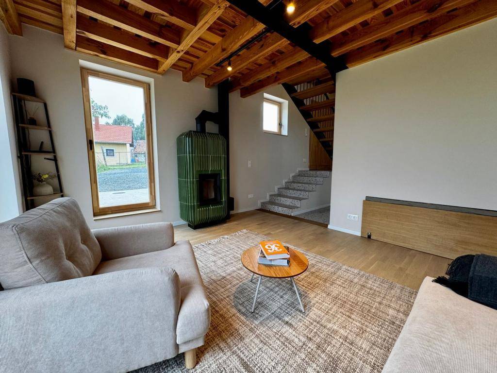 Kézzel gyártott tömörfa bútorok, gyapjúszőnyegek, valamint egy Laufer designer cserépkályha ad karaktert és valódi otthonérzetet.