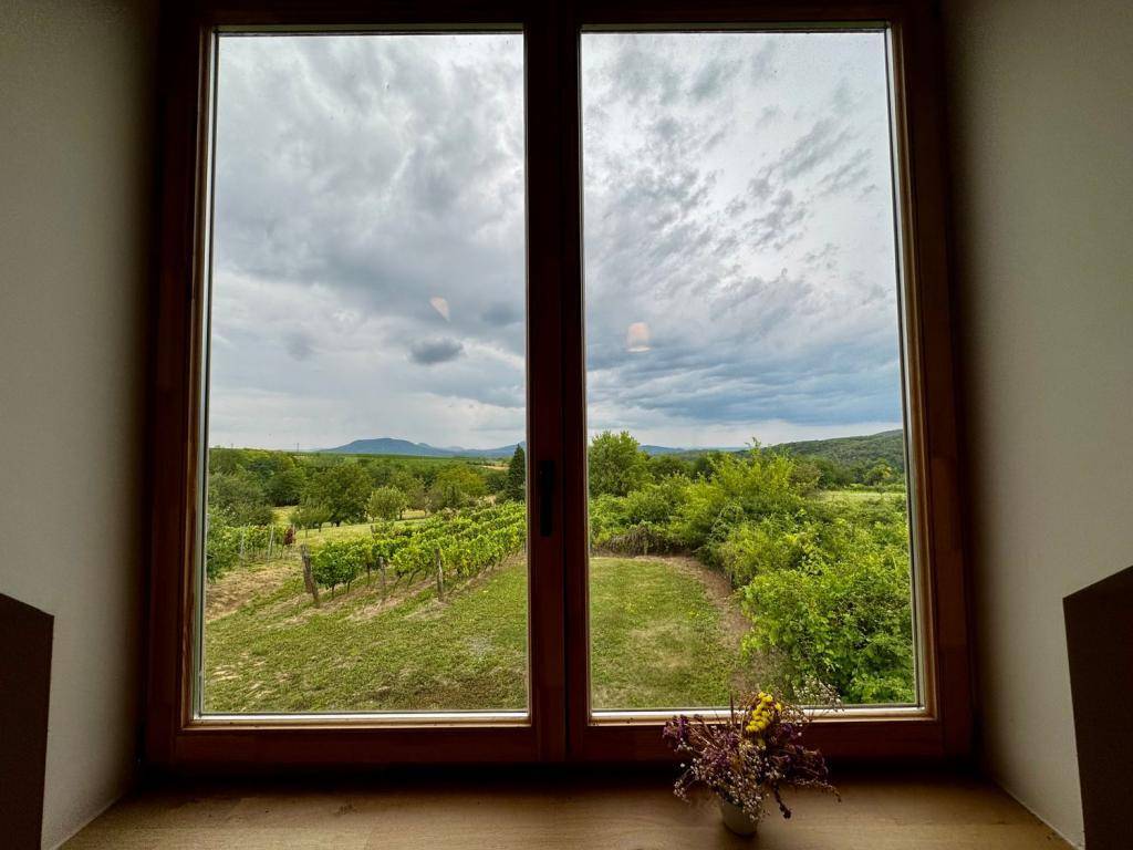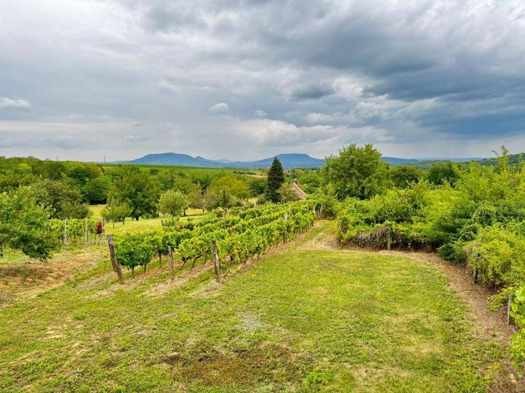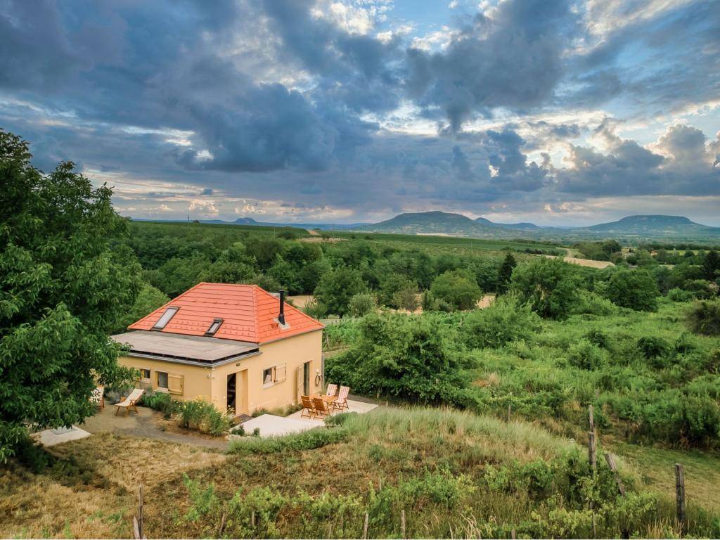 A panorámás tetőteraszról a Balaton látványa és a tanúhegyek nyugalma tárul elénk.