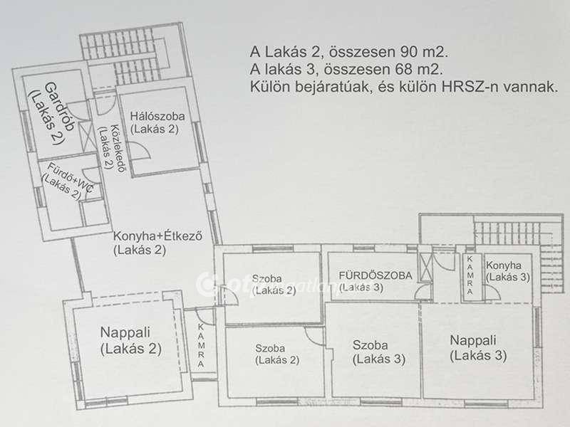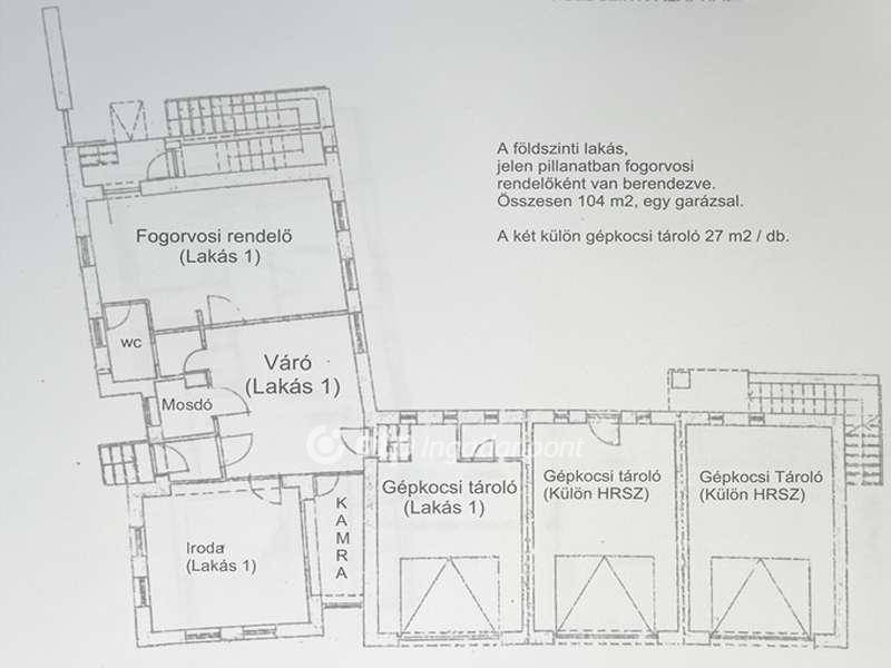 Az ingatlan 5 külön helyrajzi számon van, alapvetően társasházként szerepel, de három lakásból és három gépkocsi tárolóból áll, az első lakás a földszinten található, jelenleg fogorvosi rendelőként van nyílván tartva de már nem üzemel, ehhez tartozik egy gépkocsi tároló (összesen 104 m2), amely mellett még kettő van (27 m2 / db). Az emeleten található további két lakás, a nagyobbik 90 m2, ebből nyílik a galéria ami jelenleg az unokáknak játszó szoba, a szomszéd lakás közel 70 m2, mindegyik különbejáratú.