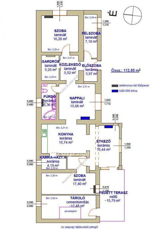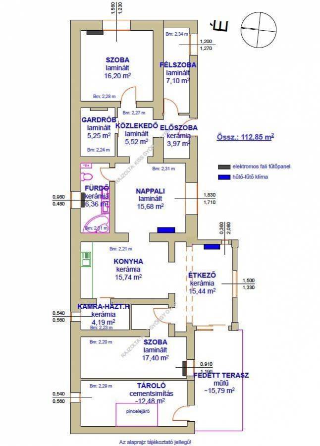 Fűtés: 3 db elektromos fali fűtőpanel, 2 db klíma.