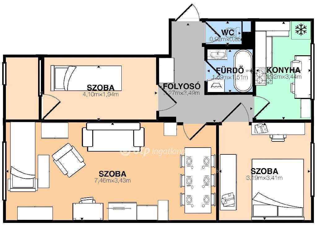 Az ingatlan két szobával és egy külön nappalival rendelkezik, a fürdőszoba és a WC külön helyiségben található, ami a mindennapi használatot kényelmessé és praktikussá teszi. A lakáshoz loggia tartozik, amely jelenlegi kialakításában tárolóként funkcionál, ugyanakkor adottságai lehetővé teszik más jellegű hasznosítását is. Az ablakok redőnnyel felszereltek, a szellőztetésre használt nyílászárókon szúnyogháló is található.