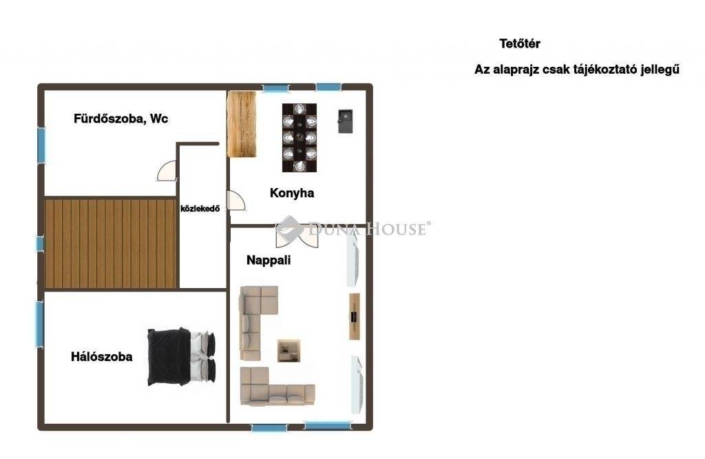 Nappali cserépkályhával, két helyiségből is megközelíthetőHálószobaTetőtér:Tágas fürdőszoba sminkasztallal és káddalHálószobaKonyhaNappali