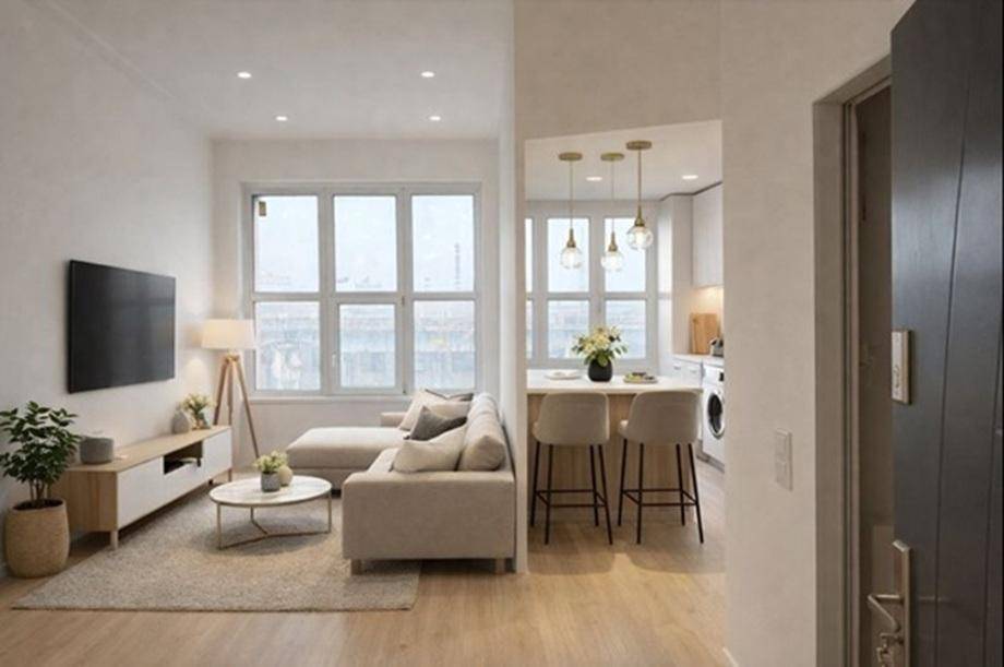 nappalikonyha egy légtérben, világos, könnyen berendezhető helyiség.