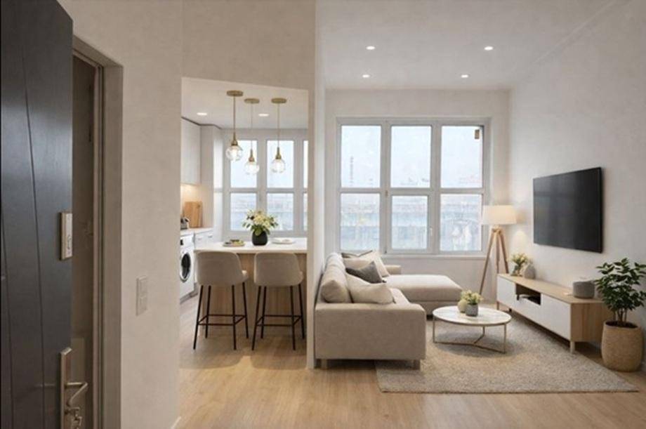 nappalikonyha egy légtérben, világos, könnyen berendezhető helyiség.