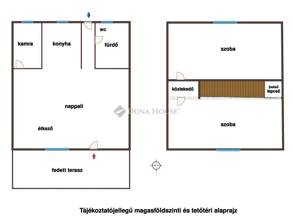 magasföldszinten: 34 m2- nappali-konyha-étkező, kamra, fürdő - wc.