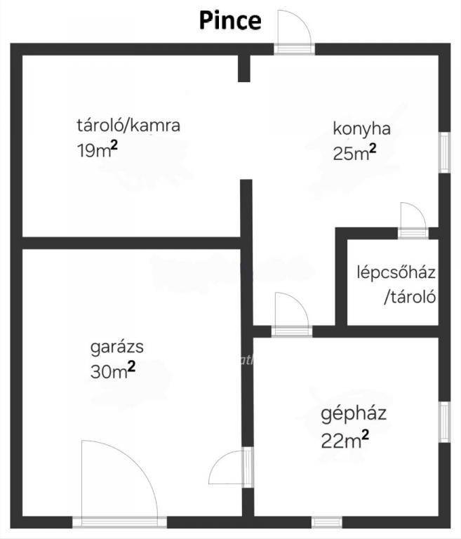 A pince részben található egy fűtött kis konyha, egy 30 m2-es garázs autóbejárattal, valamint egy tágas, 19 m2-es tárolóhelyiség.