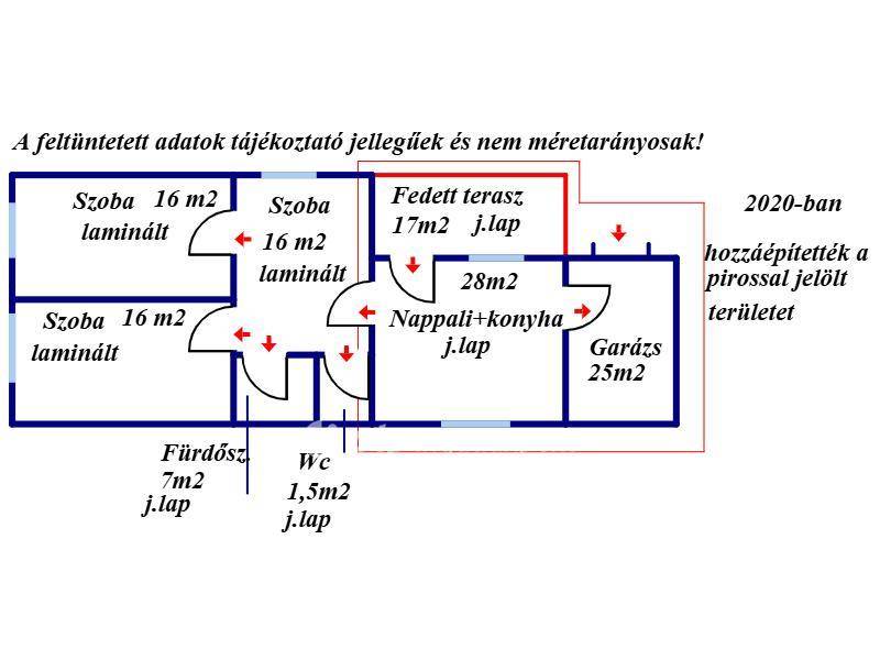Eladásra kínálunk Szügy községben egy 85 m2 vegyes szerkezetű 2020-ban teljes körűen felújított kiváló állapotban lévő családi házat. Ebben az évben bővítették az ingatlant, hozzáépítették a nappalit és a garázst. Ezt az alaprajzon piros vonallal jelöltem. A garázs távirányítású ajtóval rendelkezik, így maximális kényelmet biztosít.