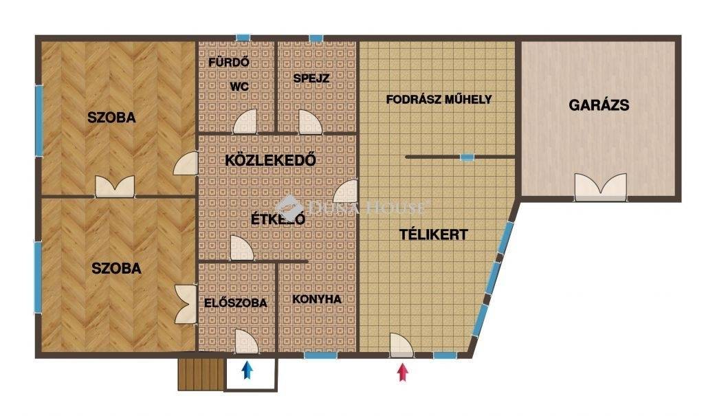 Hasznos lakrészen 2 utcafronti nagy szobából, előszobából, télikertből, étkező-közlekedőből, konyhából, fürdő-wc-ből, spejzból ( innen van feljárat a padlásra ) és egy olyan helyiségből áll, ami fodrász műhellyé lett alakítva.