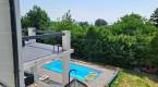 A kertben feszített víztükrű medence , nagyméretű napozó terasszal áll a lakók rendelkezésére.