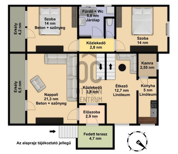 Helyiségek: nappali + étkező, 2 hálószoba +fürdőszoba + WC