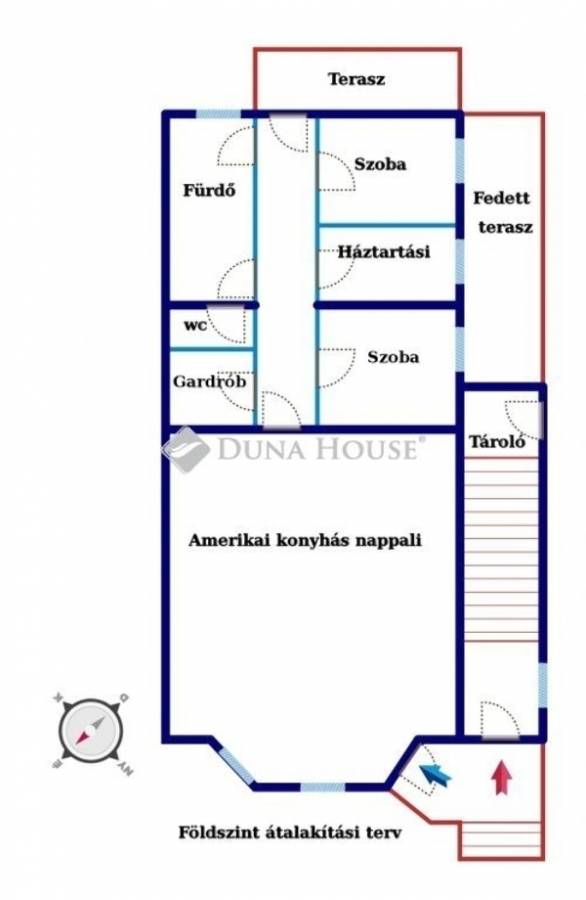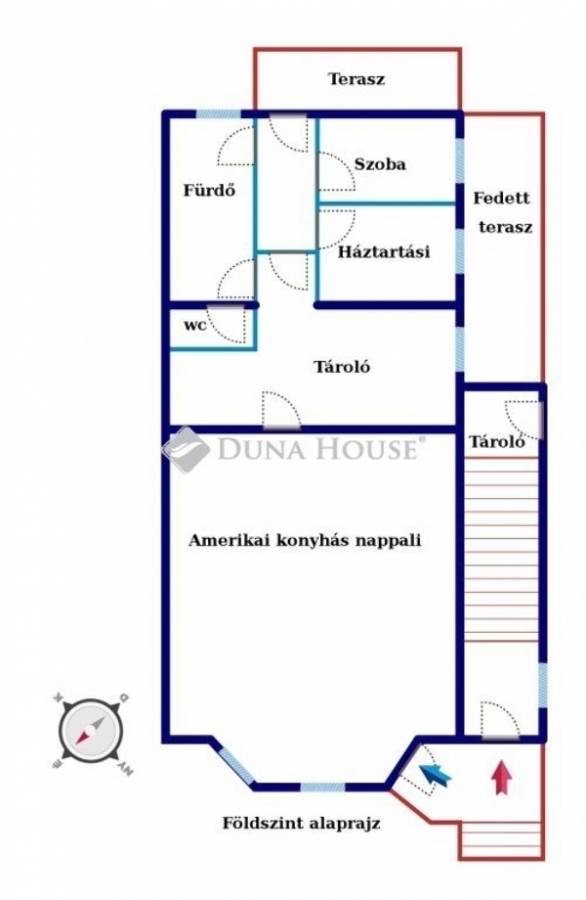 A földszinten amerikai konyhás-étkező-nappalit lehet kialakítani a jelenleg hatalmas 42 nm-es nappaliban. Innen nyílik tovább több tároló helyiség, melyek szobaként is funkcionálhatnak, illetve fürdőszoba és wc. Kivülről van még egy tároló illetve több fedett és nyitott terasz.
