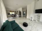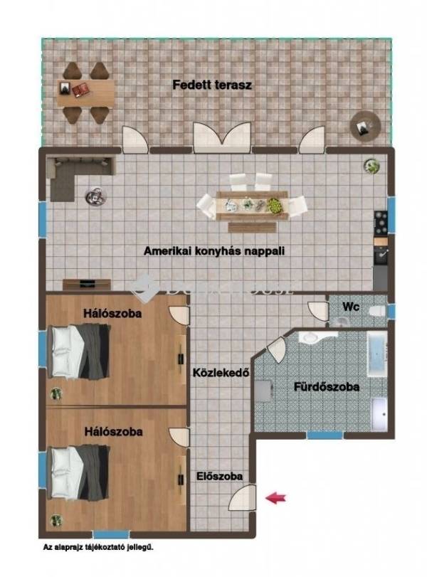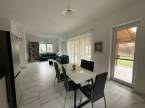 elegáns, amerikai konyhás nappali, ahonnan közvetlen kijárat nyílik a hangulatos, fedett teraszra