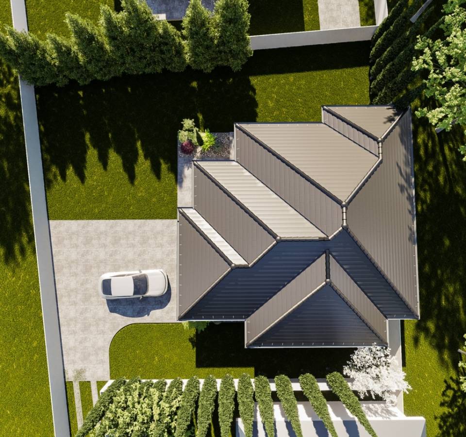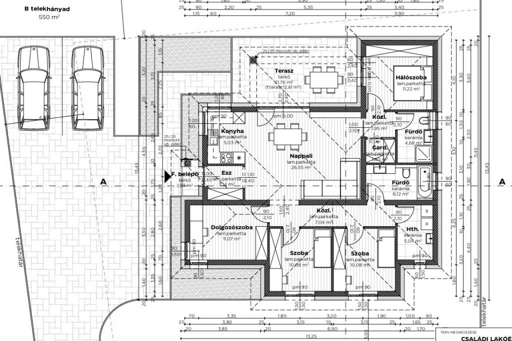 Elosztása: 4 szoba, nappali-konyha, 2 fürdőszoba, gardrób, háztartási helyiség, nagy terasz (udvari részen két kocsibeálló)