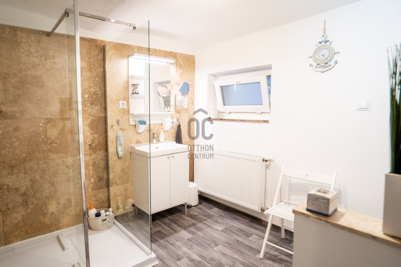 Az alsó szinten kapott helyet a nappali-konyha-étkező, 1 hálószoba, kamra, zuhanyzós fürdőszoba és egy tágas mosókonyha