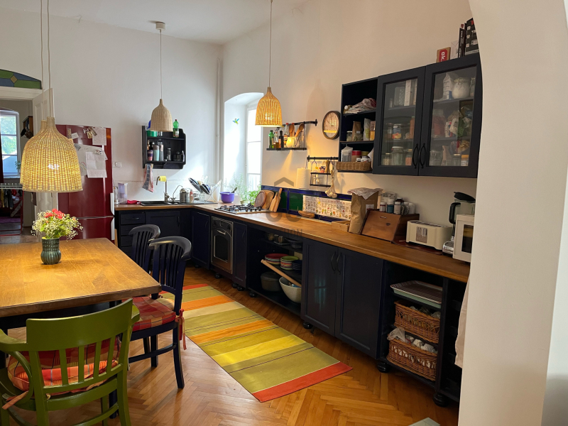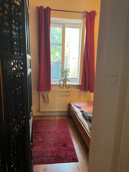 Helyiségek: nagy konyha (keleti és nyugati ablakokkal) és vele egy boltíven keresztül egybe nyíló, nagy nappali (déli ablakokkal), hálószoba (észak-keleti ablakkal a csendes, hársfás udvar felé), fürdőszoba (keleti ablakkal), külön wc, előtér (nyugati ablakokkal), előszoba (nyugati ablakokkal), a folyosó kerékpár tárolásra is alkalmas, a lépcsőházban a bérleményen kívül csak két további lakás van, kedves , csendes szomszédokkal.