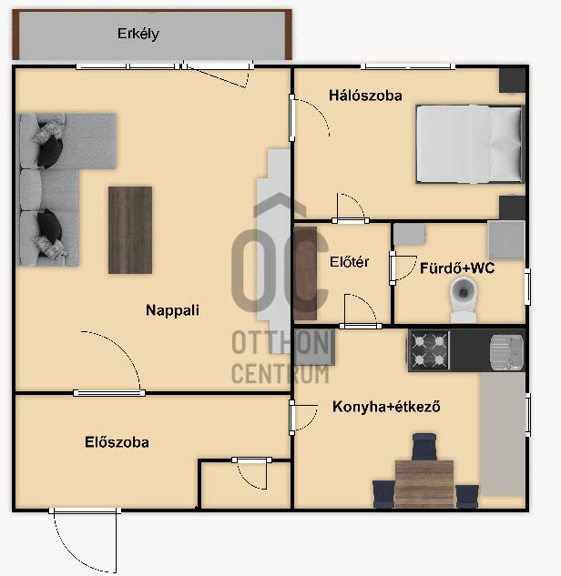 Az ingatlan az alábbi helyiségekkel rendelkezik: nappali, hálószoba, konyha+étkező, zuhanyfülkés fürdőszoba+Wc, közlekedő, előtér.